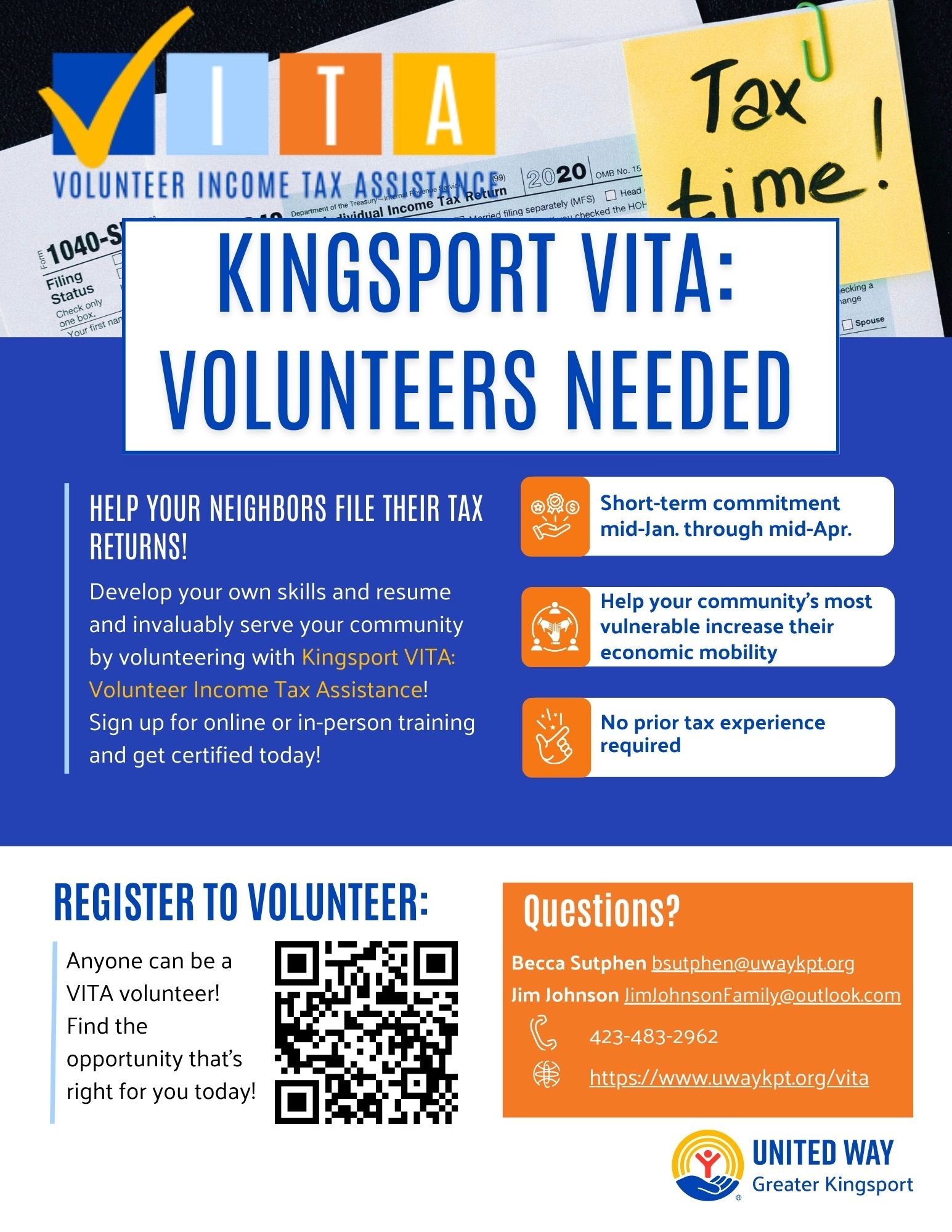 CONTACT BECCA at 423-378-3409 x130 to learn how to be a VITA volunteer!!!